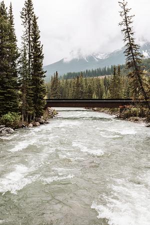 Railroad bridge over rainy river rapids in the Rocky Mountains, Canada | Photographer: Samantha Peddle